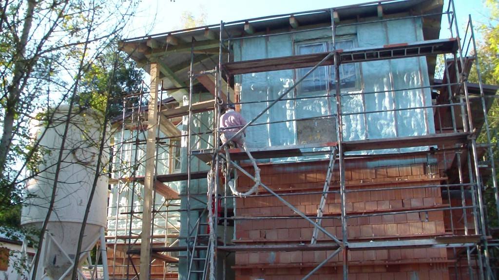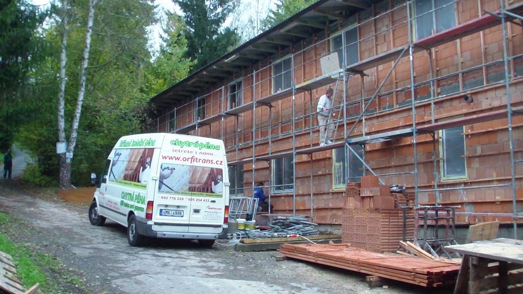Zateplení fasády v BušínověOdvětrávaná fasáda školící středisko Bušínov – tepelná izolace izolační pěnou, záklop z modřínových desek. Fotografie